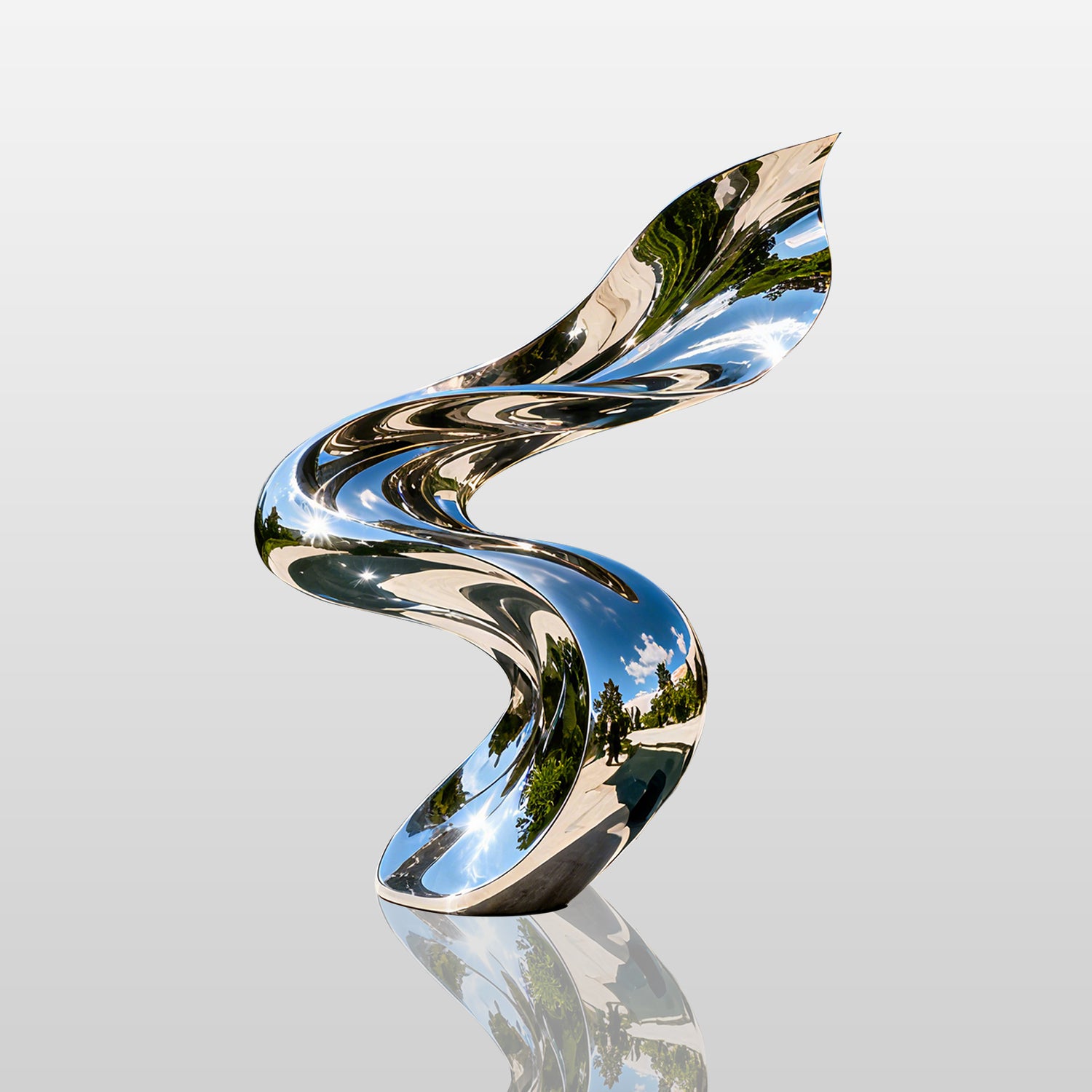 This sleek modern sculpture crafted from high-polished stainless steel features a dynamic twisting form that reflects light and surroundings, creating a fluid, ever-changing visual experience. Its unique design makes it an ideal addition to contemporary spaces like modern galleries, offices, or upscale homes. The polished finish brings an extra layer of sophistication, reflecting the world around it. It’s perfect for anyone seeking a bold, abstract sculpture that transforms a room.