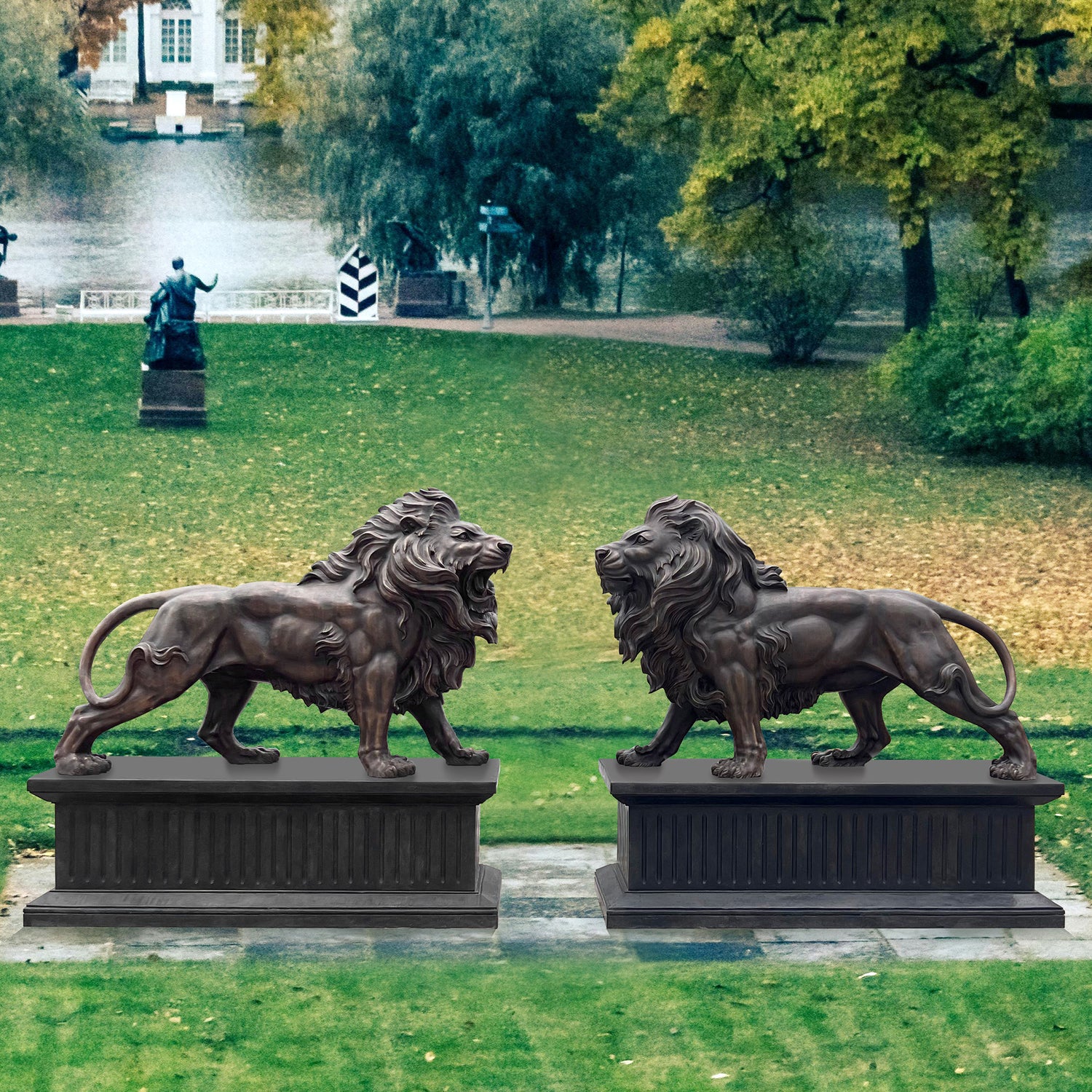 Commanding and timeless, this bronze lion statues evokes power, dignity, and classic elegance. Cast in enduring bronze with lifelike manes, each lion stands proudly atop a pedestal. Mirroring the grandeur of estates.