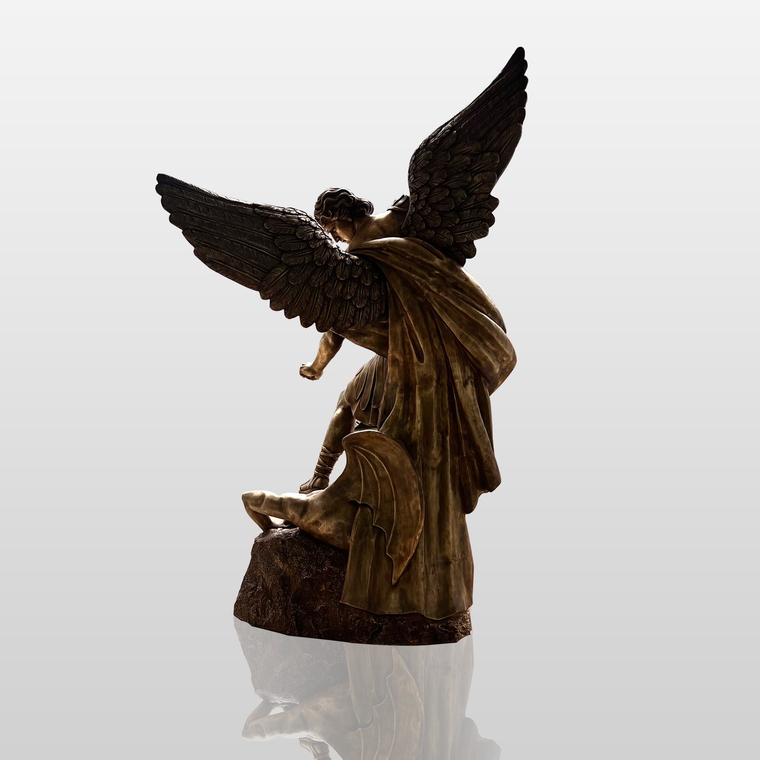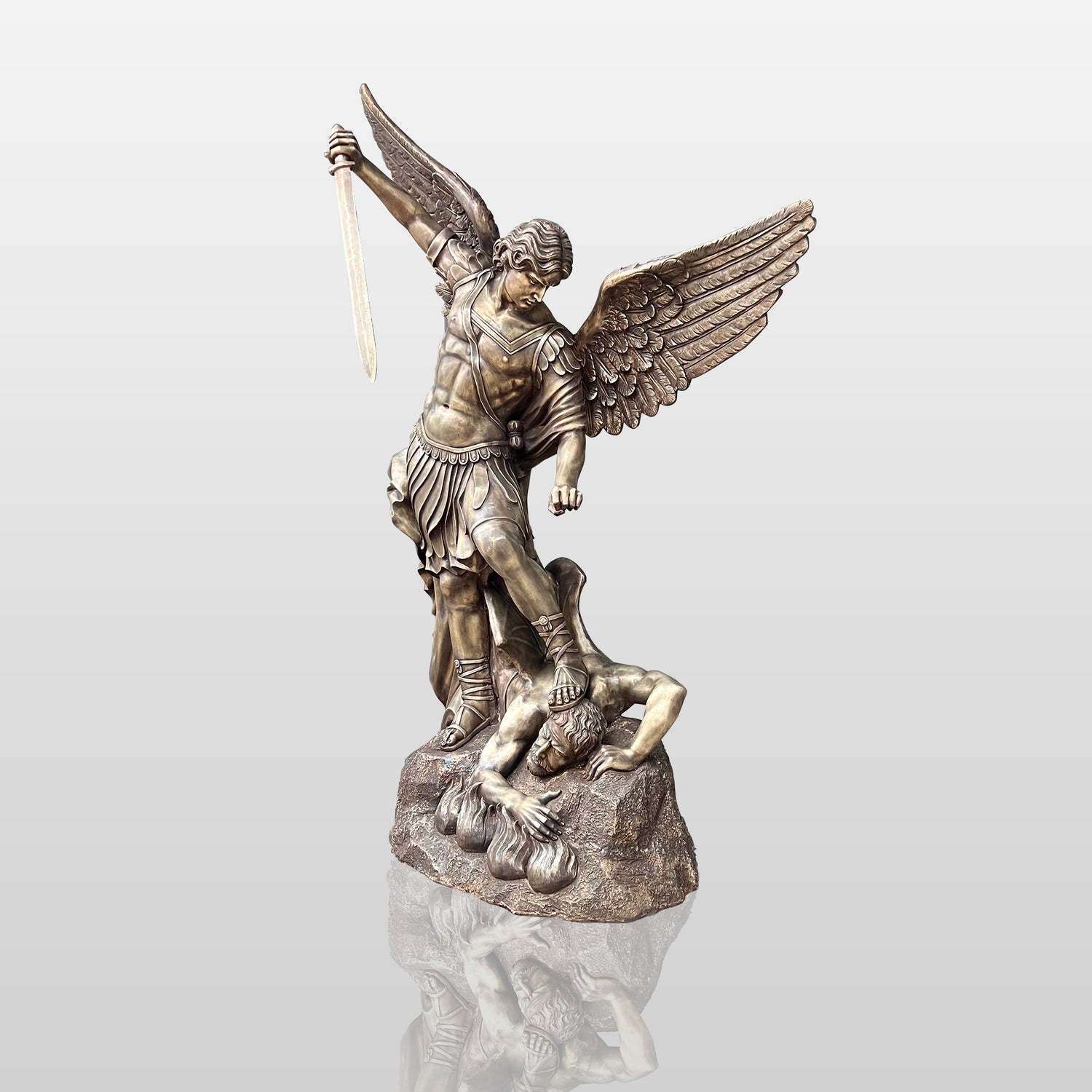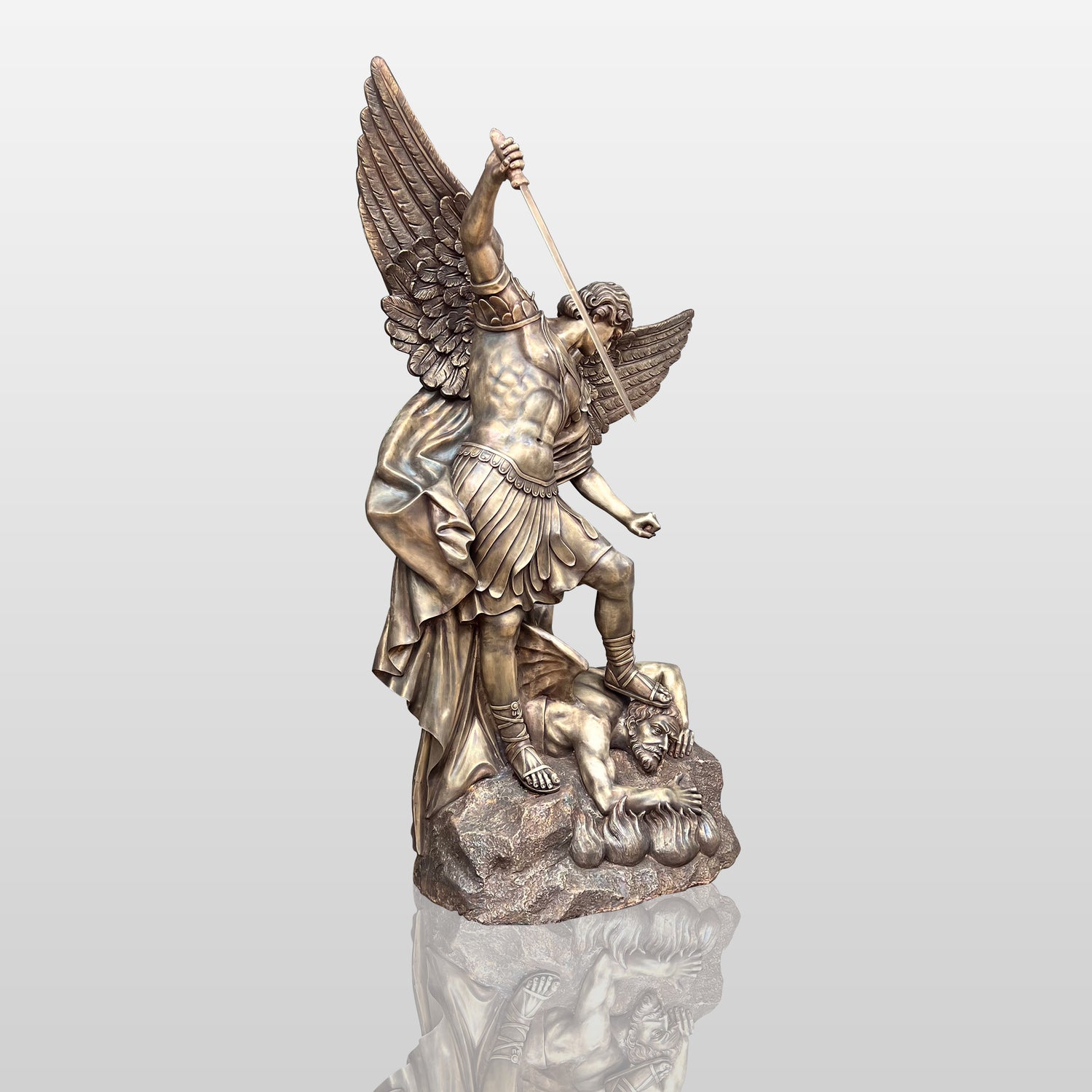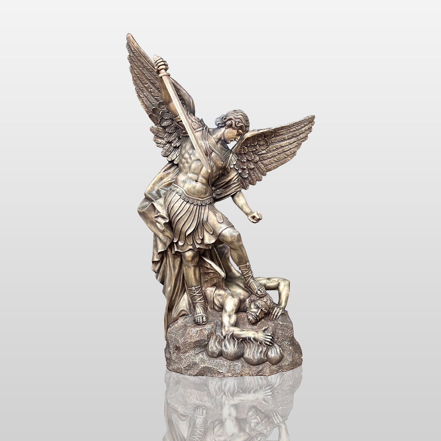 This superbly crafted bronze St. Michael sculpture highlights strength, protection and divine power. This stunning Archangel statue depicts an iconic moment of St. Michael's triumph over evil, exuding grace and authority in his dynamic pose.