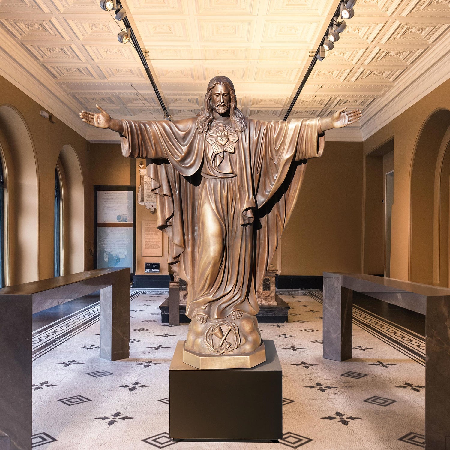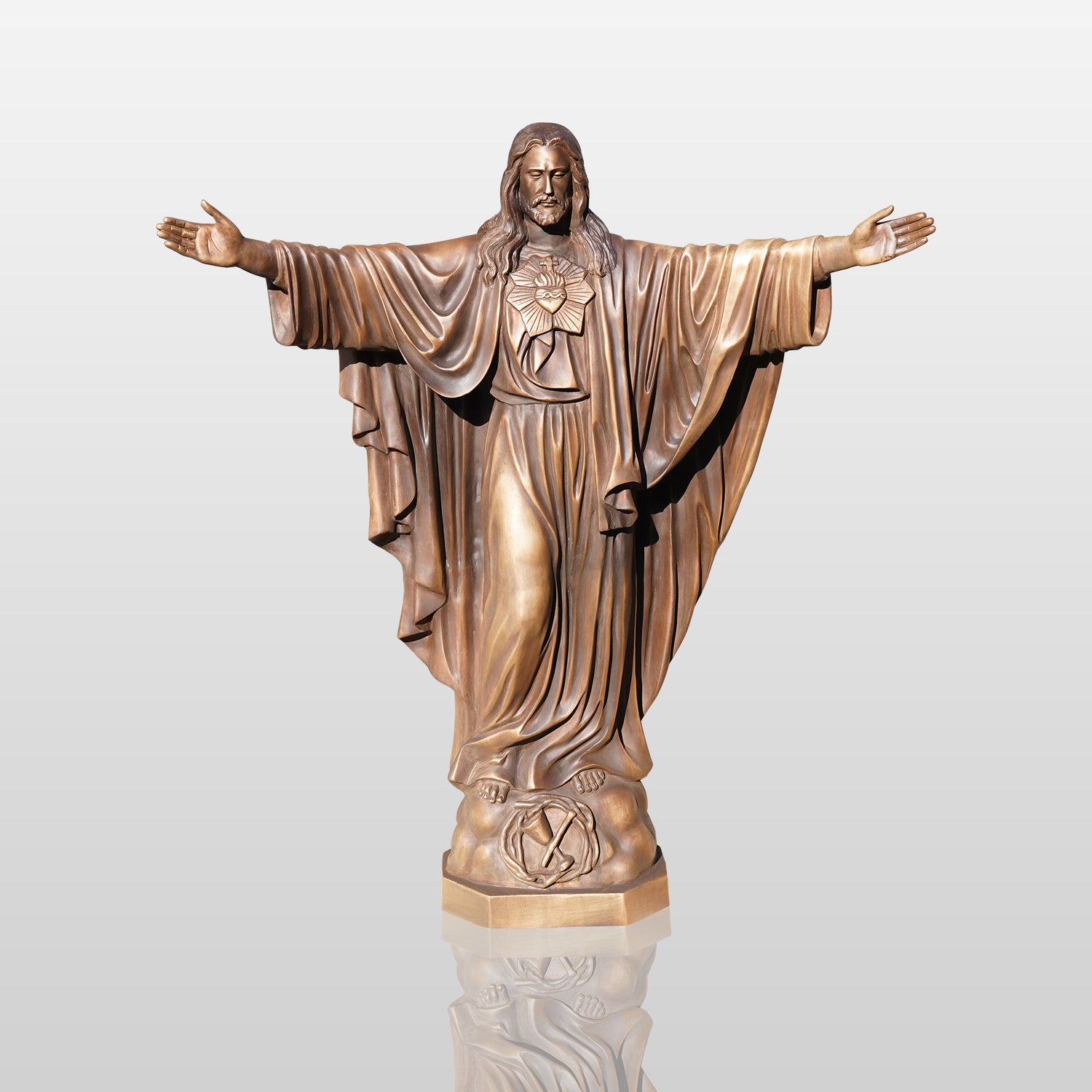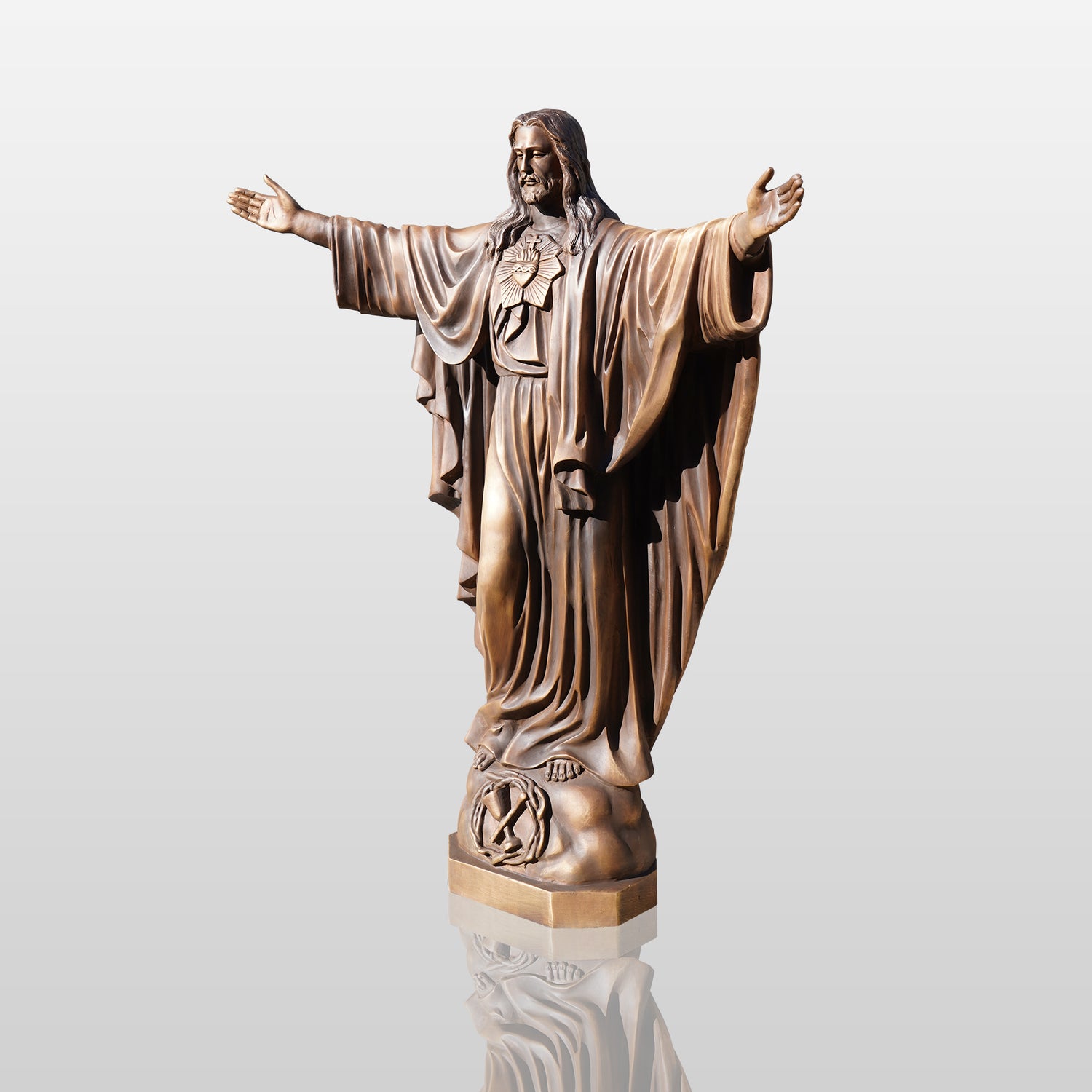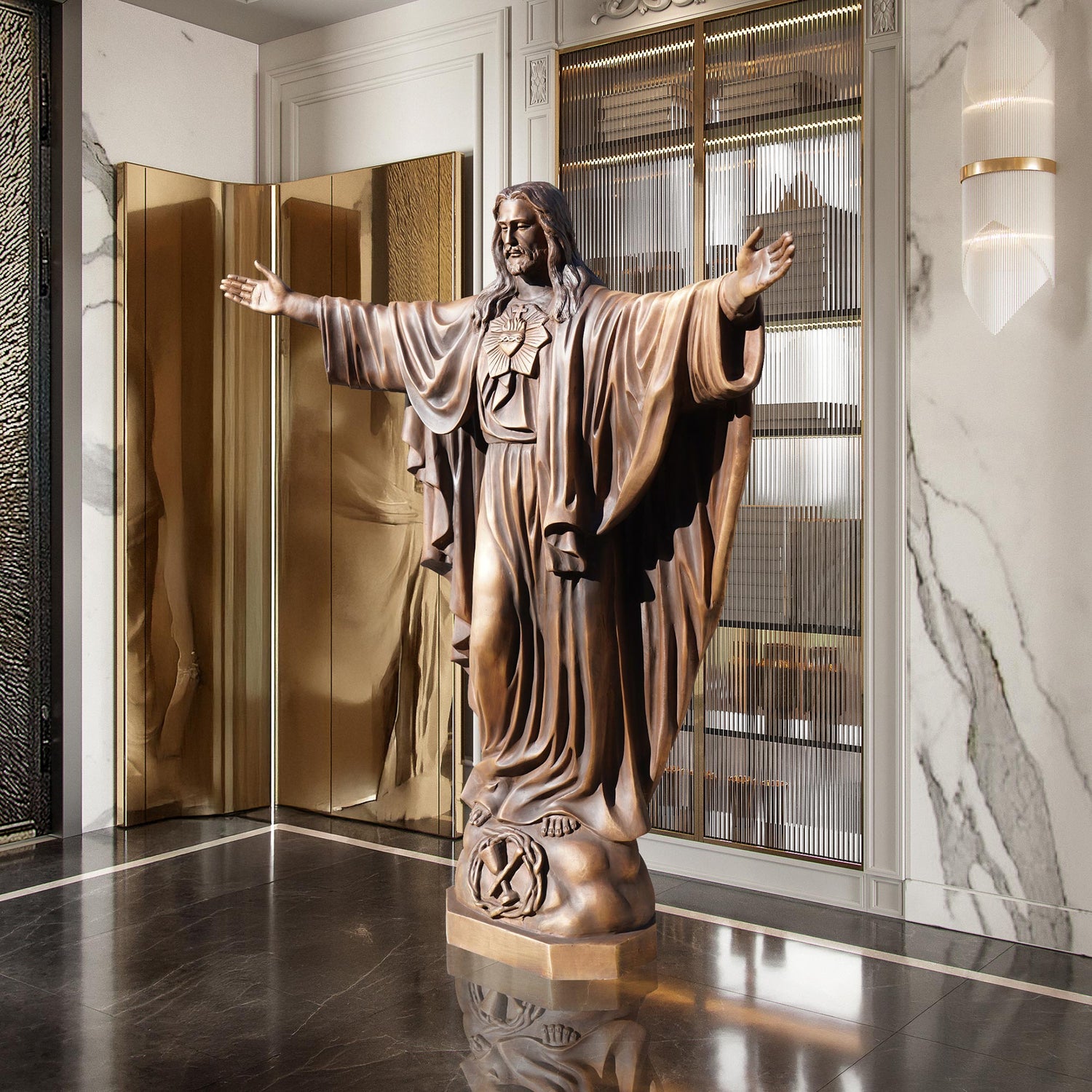 This is a beautiful Jesus bronze statue. With his arms outstretched, he embodies love, compassion, and divine grace. In the center of his chest, the Sacred Heart is prominently displayed, symbolizing his everlasting love and sacrifice for humanity. This religious sculpture is made of high-quality bronze and features exceptional detail. It is an ideal piece for adding spiritual elegance to churches, chapels, prayer rooms. This bronze statue of Jesus will inspire reflection, prayer, and peace.