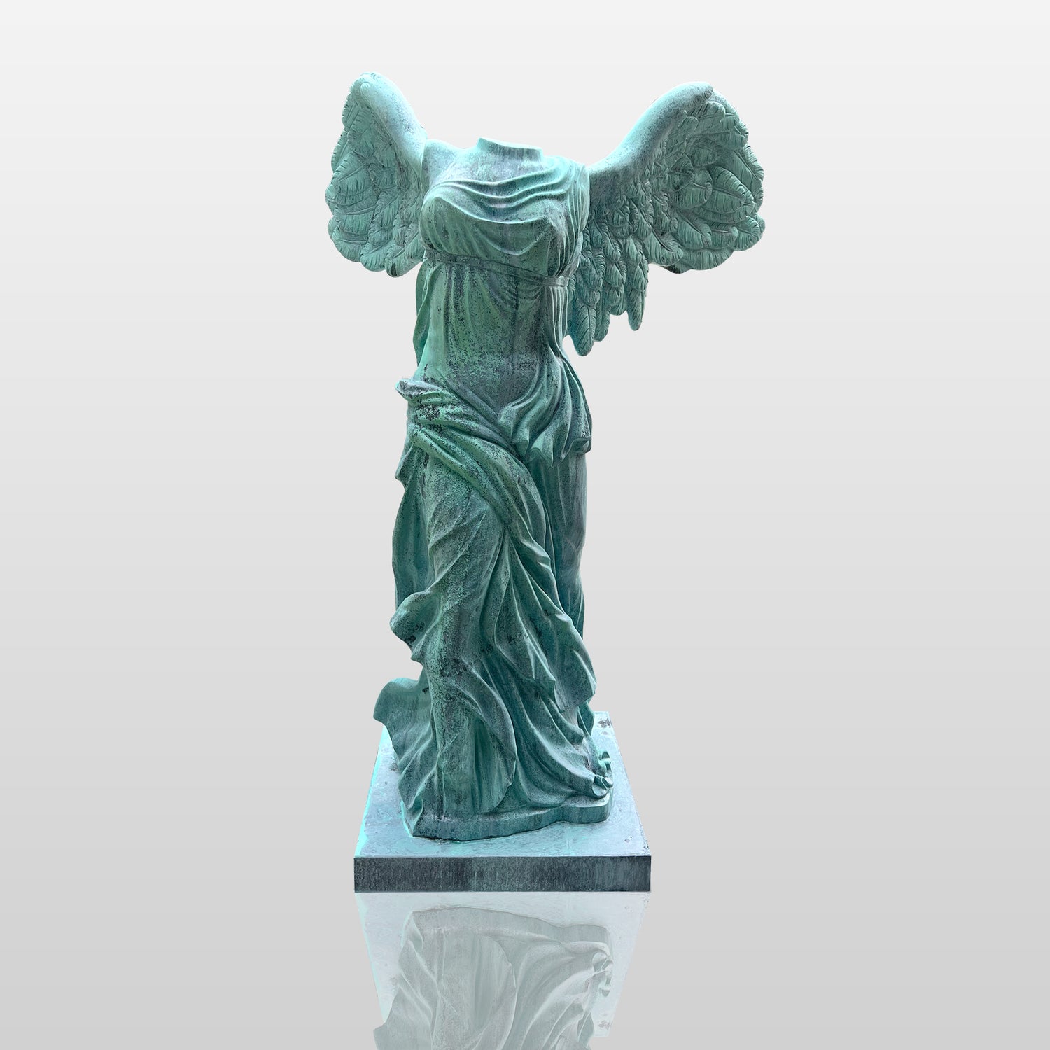Cast in richly patinated bronze, this monumental piece is ideal for institutional courtyards, museum gardens, corporate campuses, or memorial spaces seeking to make a lasting statement. The absence of a face makes the symbolism universal—Victory is not personal, but collective. Her wind-blown robes suggest forward movement, reminding viewers of resilience and rising beyond.