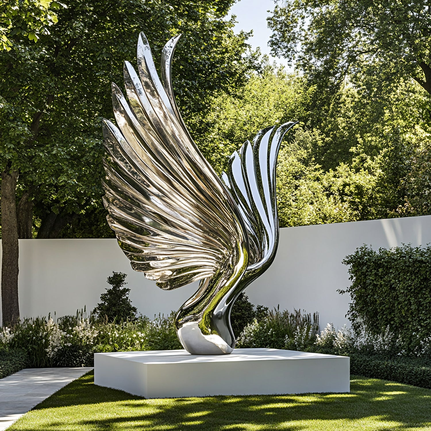 The PREMIER Stainless Steel Wing Sculpture rises from the earth like a captured moment of flight—an abstract tribute to freedom, elevation, and grace. Crafted from highly polished stainless steel, this reflective stainless steel statue reflects its environment with clarity, catching sunlight and shadows as they move across its surface throughout the day.