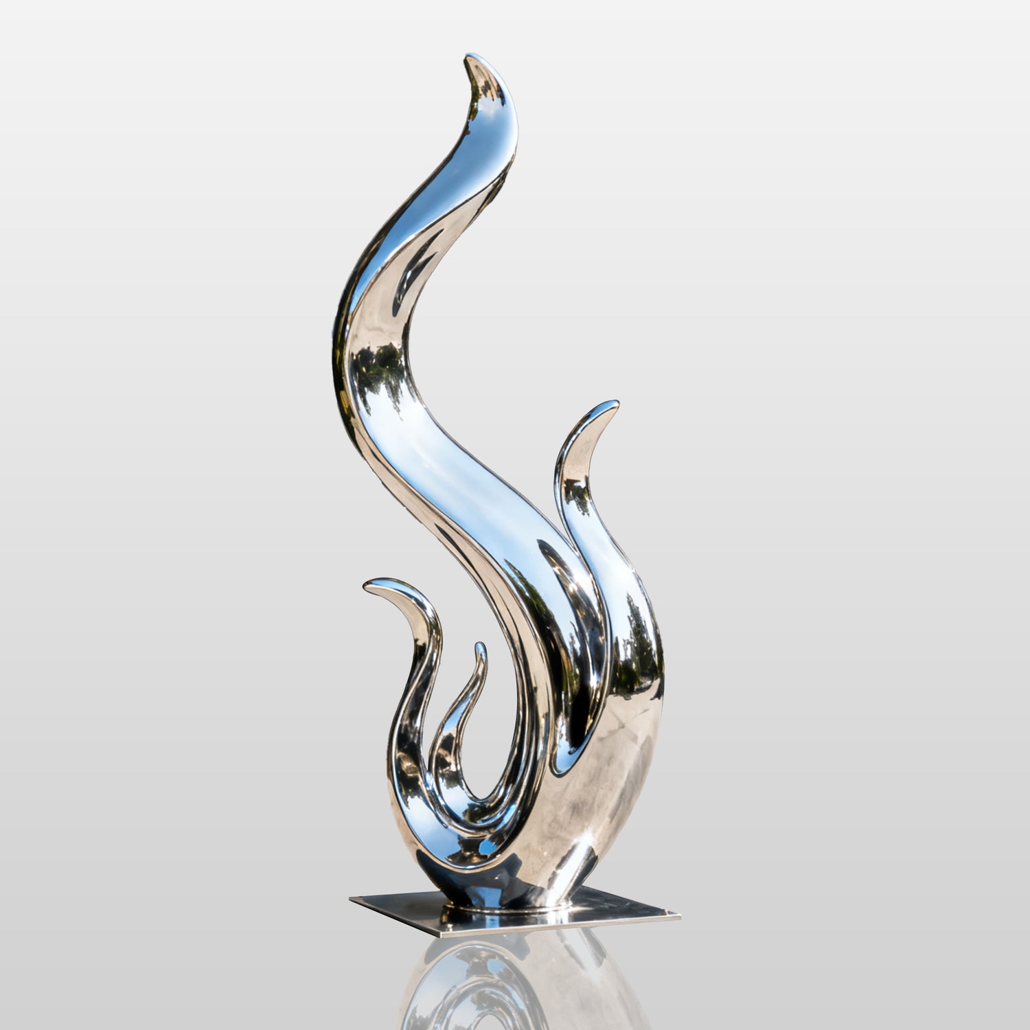 This abstract stainless steel flame sculpture brings a sense of motion, energy, and modern artistry to any outdoor setting. Its fluid wave like curves rise gracefully from the base, creating a dynamic form that feels alive with movement. The high polish mirror finish reflects light and surroundings with striking clarity, adding depth and elegance to the design.