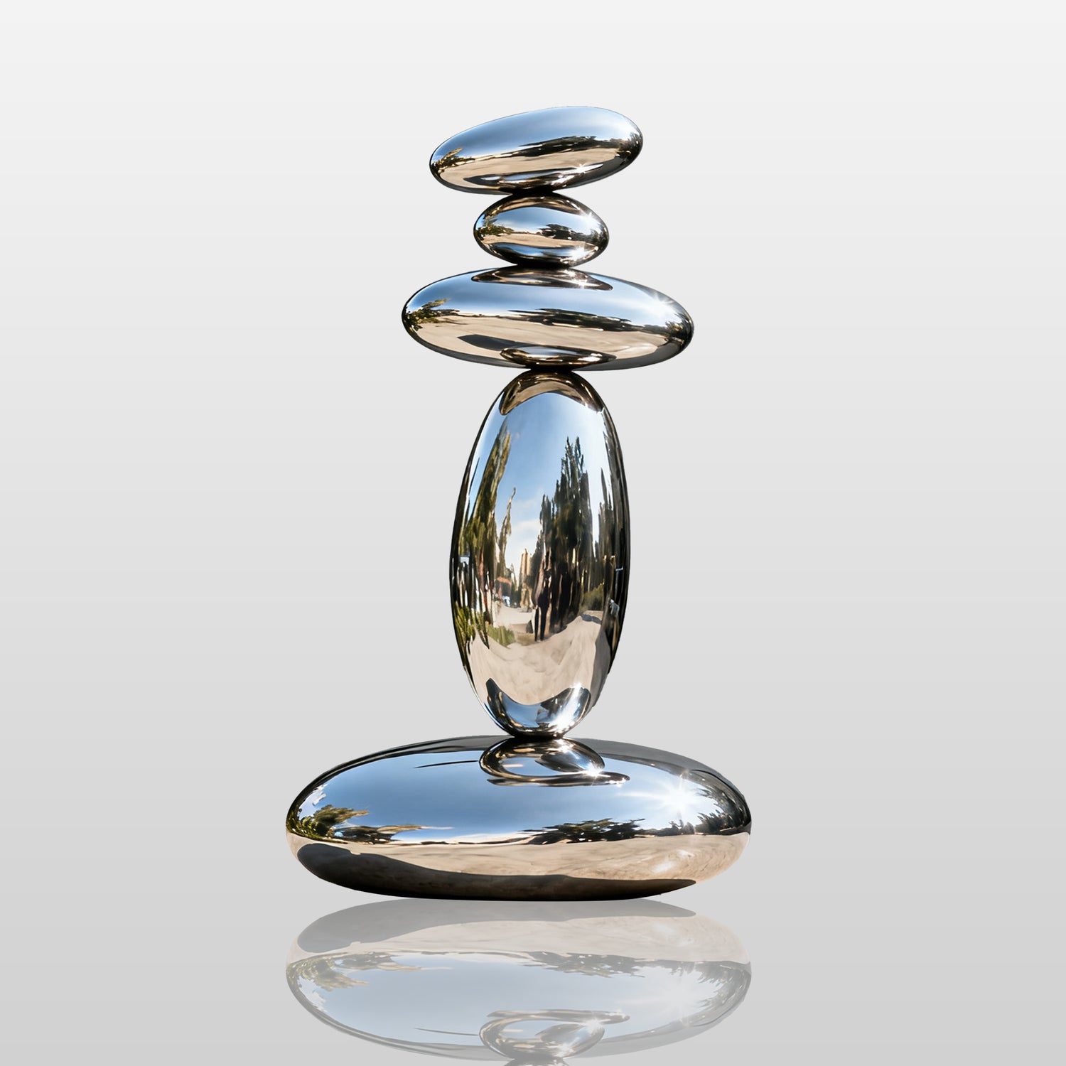 This abstract sculpture reimagines the tranquility of stacked river pebbles through a polished contemporary form. Each smooth, rounded element is carefully proportioned and balanced, creating a sense of natural harmony while maintaining a striking sculptural presence. The mirror like finish reflects surrounding light, architecture, and landscape, allowing the artwork to shift in character throughout the day.