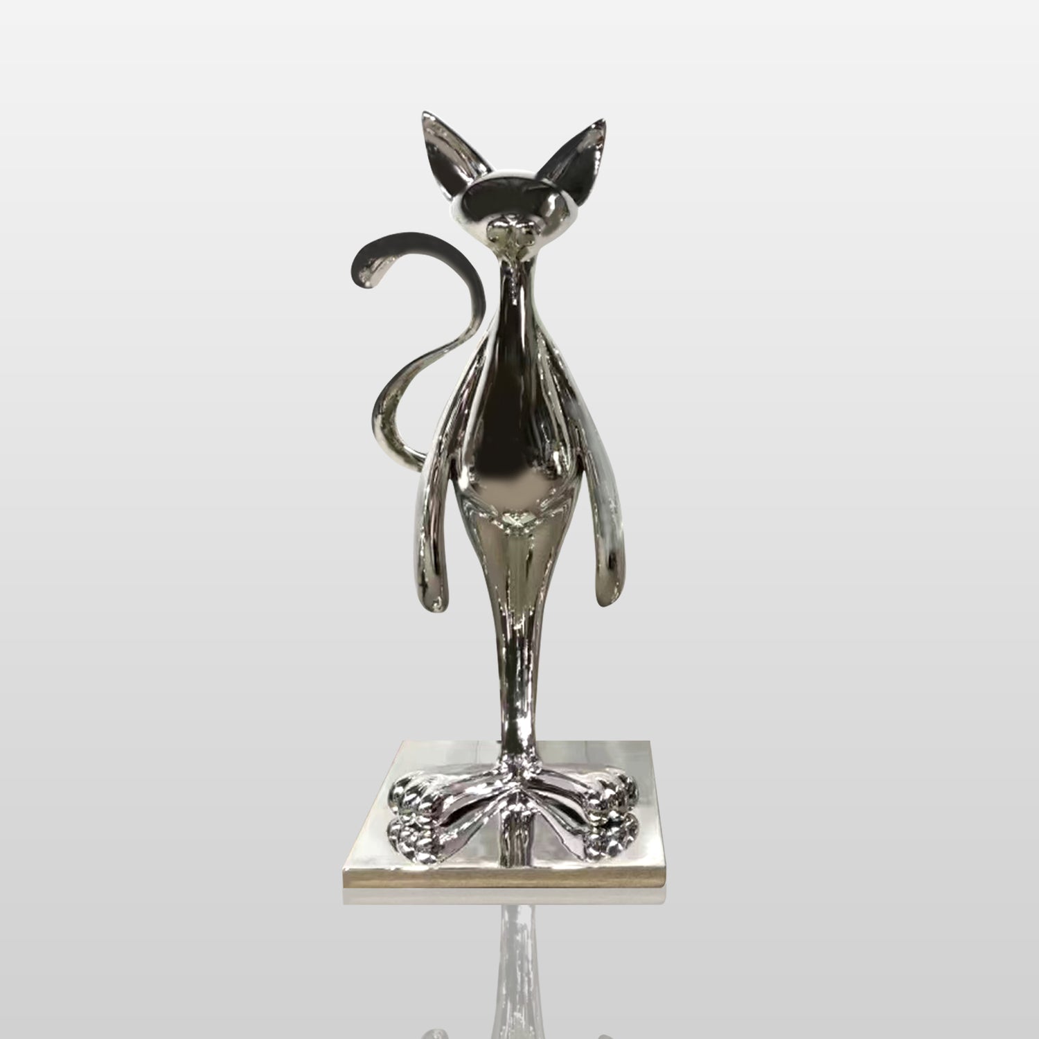 PREMIER modern cat sculpture is a stunning contemporary art that blends stylish design with feline elegance. Crafted from high-quality, reflective stainless steel, this abstract contemporary sculpture is a perfect blend of contemporary elegance and playful design. The sleek, elongated features of the cat, including its slender body, long legs, and gracefully curved tail, create a striking visual impact.