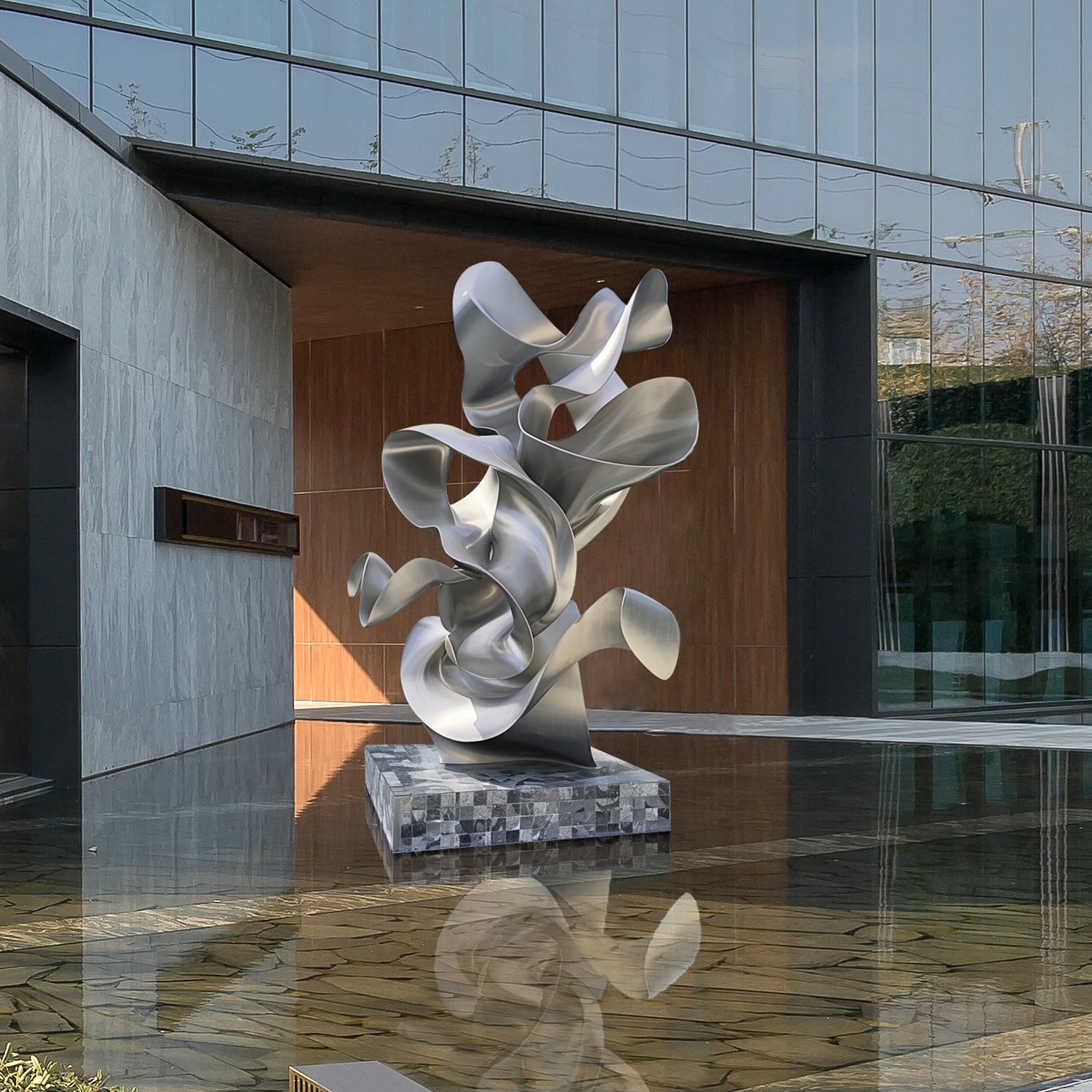 The "Serenity in Motion" custom statue is a stunning piece of modern art. This artwork captures the fluidity and elegance of movement in a charming stainless steel design. Meticulously crafted in detail, this stunning custom garden sculpture has smoothness. Flowing curves, interweaving and twisting, create a sense of eternal movement. The reflective surface of stainless steel adds depth and vitality as it interacts with light and the surrounding environment.