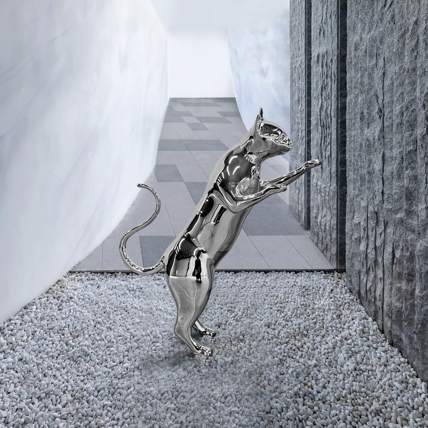Made from premium mirror-polished stainless steel, it reflects light and environment, adding kinetic life to its stillness. Whether placed in a stone courtyard, beside a gallery wall, or at the entrance of a luxury space, this cat statue transforms its surroundings with a quiet, modern charm.