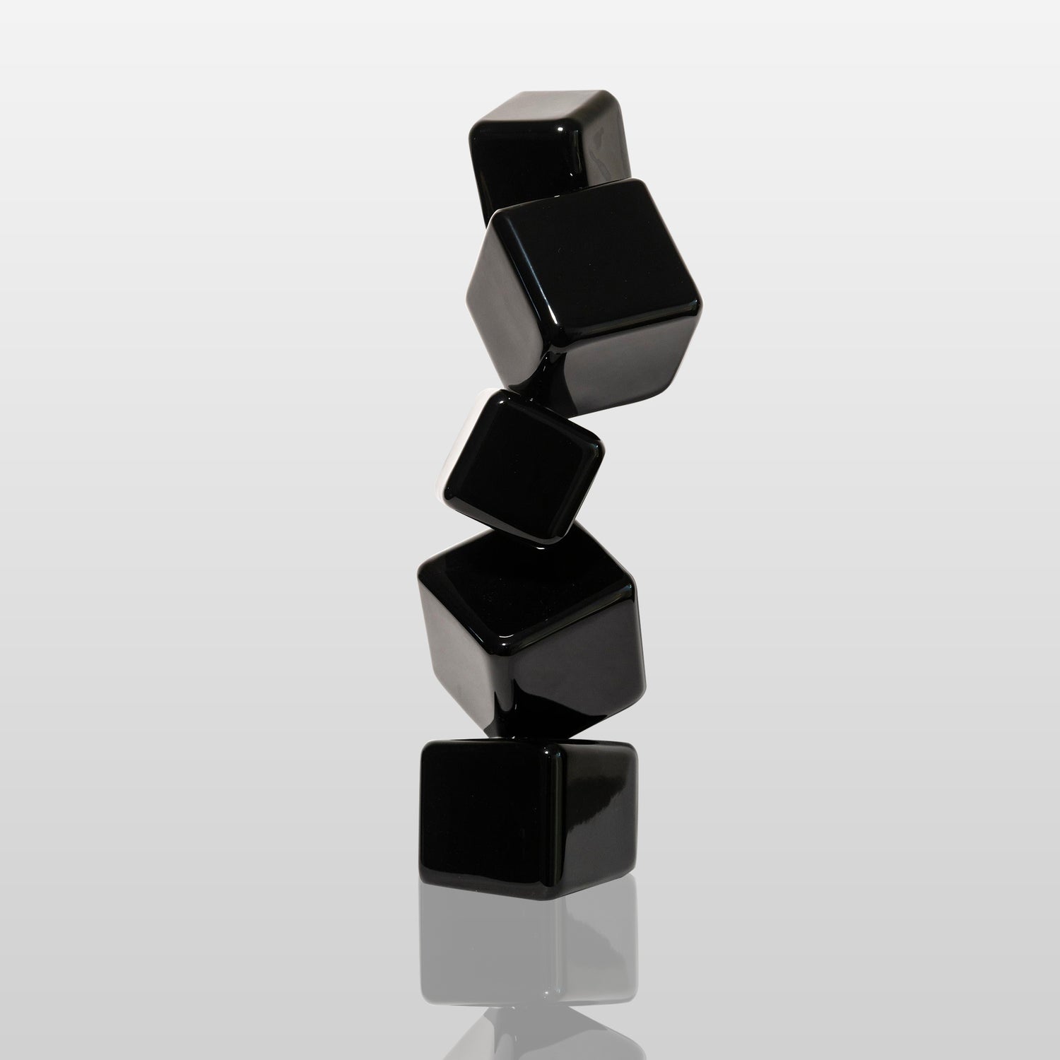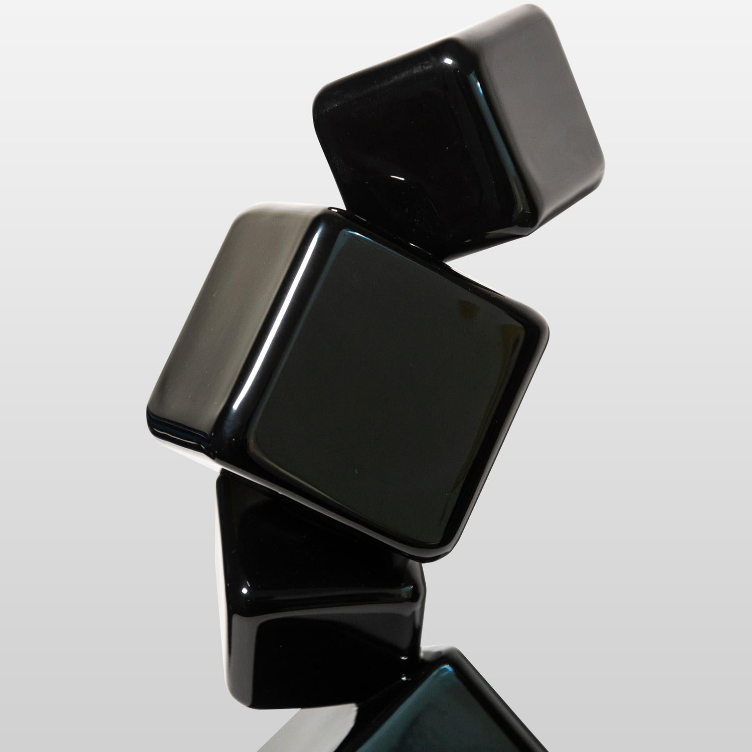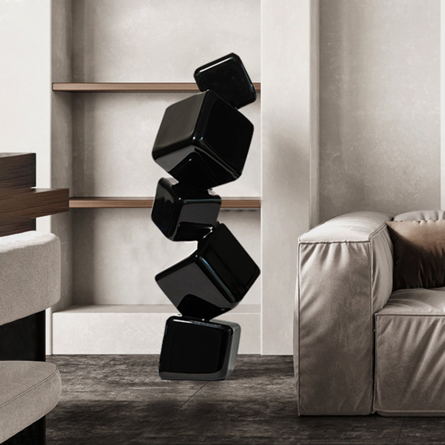 Cette sculpture de décoration d'intérieur moderne PREMIER rappelle la forme de dés qui tombent : les cubes individuels sont empilés à des angles précaires, les uns sur les autres. La finition brillante et brillante anime et accentue la forme moderne. Cette sculpture de décoration d'intérieur contemporaine présente une série de cubes noirs élégants et brillants méticuleusement empilés, créant un spectacle visuel d'équilibre. Chaque cube est savamment conçu avec des surfaces lisses et polies qui reflètent magnifiquement la lumière, ajoutant un élément dynamique à n'importe quel espace.